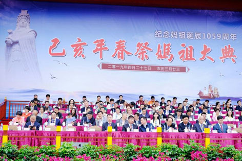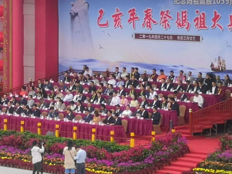 紀念大會后,還舉行了己亥年春祭媽祖典禮等活動。來自臺灣云林北港朝天宮、高雄路竹天后宮等40家臺灣宮廟代表和香港、澳門地區媽祖信眾,以及阿根廷、泰國、越南、老撾、馬來西亞等國家的媽祖信眾代表近萬人歡聚圣地,同沐福澤,共慶圣誕。930分,農歷己亥年春祭媽祖典禮開始,可納2萬人的湄洲島天后宮廣場座無虛席,禮臺中央,媽祖金身端莊肅穆,三獻樂舞畢,825米長的彩色巨幅綢帶象征各國民心匯聚的“海上絲綢之路”,涌向媽祖金身,寓意海洋文化與媽祖文化完美融合。旌鼓禮炮聲中,海內外信眾依古制三跪九叩,同謁媽祖,祈愿兩岸和平,民族昌盛,絲路復興。為期六天的紀念媽祖誕辰活動期間,來自各地的120支民俗表演隊4500多人輪番上陣,為海內外媽祖信眾、游客獻上一場精彩紛呈的文化盛宴。