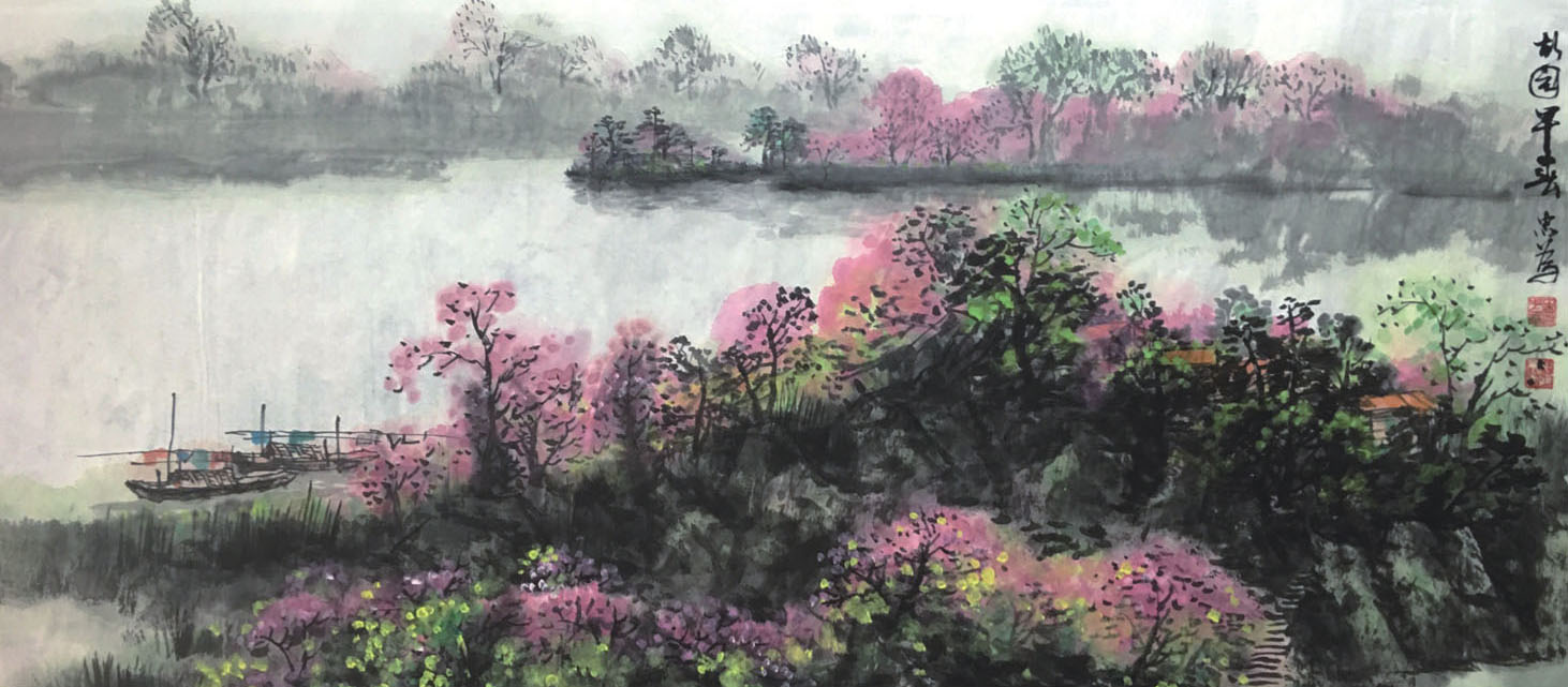 觀他的畫,色彩布局非常細膩,表現出光影下大自然的那番空靈、清幽、寧靜。曾有詩句“鳥鳴山更幽”,我想說“朦朧愈空靈”,朦朧總給人一種意猶未盡的感覺,空靈不是一覽無余。如他在二月的畫作中,整幅的畫有如被淡淡的霧所籠罩,整個山色在云霧中變得更加嫵媚婀娜。又有如在四月月歷的那幅畫,村莊畔著河,幾葉輕舟泊在岸邊,在他的筆下,河水可見微波;在他的筆下,天的藍色,不是用藍色表現,而是用白色體現,但人看了,在白中不僅見得天藍,而且見天之遼闊無際。