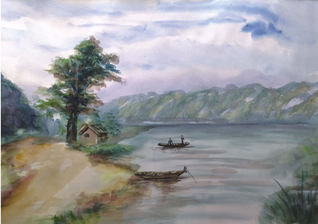 水彩畫是用水調和透明顔料作畫的一種繪畫方法,由于色彩透明,一層顔料覆蓋另一層產生出的特殊效果。觀余凡的作品,把握了水彩畫的精髓。他今年選作月歷的畫作,多選于南方的大自然,山水村舍、田園風光。南方的風光空靈秀氣,氣象氤氳萬千,恰好與他的畫風相合,利于他的表達。