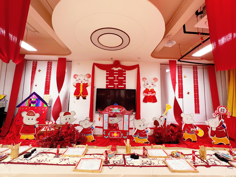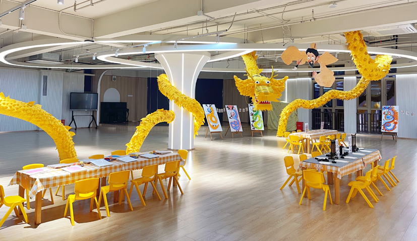 看,哪里來的鑼鼓聲,這么熱鬧,原來是小孩子喜氣洋洋,抬起了花轎。這個區(qū)域非常熱鬧,紅紅火火。抬花轎這個游戲出自《老鼠嫁女》繪本。由小朋友來演繹,有一番特別的滋味。有一個小朋友說,這是她第一次抬轎子,她的感受是要合作,轎子才會穩(wěn)。四個人抬轎子,一定要齊心協(xié)力,才能夠穩(wěn)當(dāng),小朋友在游戲中學(xué)到了知識。那么,這么有趣的小游戲是怎么設(shè)計(jì)出來的?據(jù)幼兒園老師胡夢佳介紹,平時和小朋友一起學(xué)習(xí)的時候,發(fā)現(xiàn)小孩子對《老鼠嫁女》這個繪本非常感興趣,里面有喜字,還有花轎,都是小孩子非常感興趣的,于是我們剛好通過六一繪本游樂活動,就結(jié)合起來了,讓孩子們感受傳統(tǒng)的嫁娶儀式,經(jīng)典與童趣結(jié)合在一起,感覺非常棒!在“畫龍點(diǎn)睛”尋龍記游園館內(nèi),一條金燦燦的祥龍吸引住了小朋友,里面所有的內(nèi)容都與龍有關(guān)。小朋友手中拿的也都是與龍有關(guān)的各種手工作品,有水墨畫龍的扇子,有拓印著龍的圖案的手工布袋,還有這個五顏六色的手工祥龍等等。