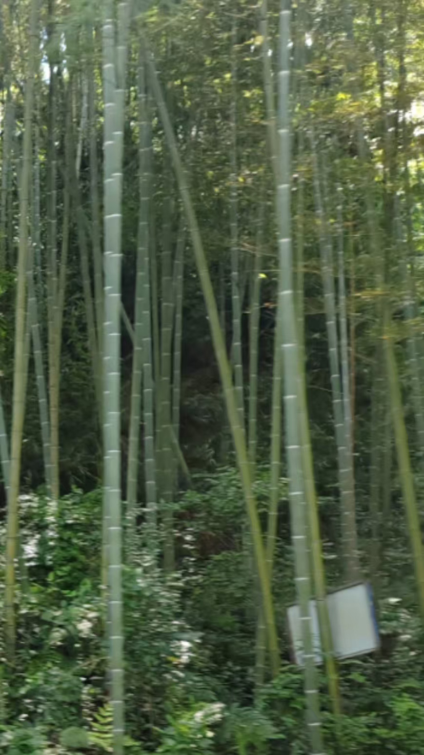 我來到研究院門前,此時山頂已云開霧散,蘭天一片。只見老院長正向一批來訪者介紹竹林的情況,他先是向大家介紹了研究院右側的大片毛竹林,只見無數根毛竹直沖云霄,竹梢的翠綠與天空的蔚藍渾然一體,仿佛是一幅天作而成、高掛在天空藍綠相間的巨尺山水畫,令人看了陶醉不已。接著他又向大家介紹生長在研究所左側的奇竹。他如數家珍的指著這些奇竹說,這是丹青竹,其葉有黃、青、丹三色,相間而生。這是凝波竹,會開紅花,像石榴。這是龜背竹,老葉深裂,脈間穿孔如龜背狀。這是五色竹,從頭到腳呈黃、藍、白、綠、灰五種顏色。這是產米竹,每株竹子生長10至20個穗,每穗上大約有12粒米。這些竹子有的是移植來的,有的是自己培育的。