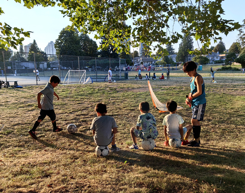 我沿著公園邊緣的步道散步,走了一圈下來,發(fā)現(xiàn)公園既沒有大門,也沒有圍欄和明顯的標(biāo)志性建筑物,只是僅僅在道路旁邊的草坪上立著一塊不起眼的牌子,上面寫著Ernie Winch Park,即溫奇公園。我想,還有什么標(biāo)志比得上這三四十畝的綠色生態(tài)公園更引人注目呢?不遠處,只見兩撥孩子分別圍著兩名教練抑或家長在踢足球,眼前這二三十多名孩子的年齡大至為七八歲,烈日下個個汗流浹背、生龍活虎地穿梭馳騁在球場上。緊挨著的兩個網(wǎng)球場又是另一番景象,一名八九歲的女孩與她的父親在打網(wǎng)球,女孩揮舞著球拍,動作嫻熟,扣球有力,儼然一位小專業(yè)運動員。一旁還有一對年輕夫妻陪著一個大約只有二歲左右的男孩玩足球,更有甚者的是,只見一個一歲多的男孩穿著尿布濕在音樂噴水廣場上被淋的濕漉漉的來回穿梭。此外,還有打排球、打乒乓球的,一些年齡更小的幼兒在家長的照看下玩滑滑梯、蕩秋千等。也有溜狗的、閑聊的、躺在草坪上聽音樂的。我的外孫和外孫女則與他的另一個同學(xué)騎著自行車在草坪上你追我趕,玩得不亦樂乎。在休息區(qū),一群大人和小孩圍著一個臨時攤點購物,我移步駐足觀看,原來是幾位母親分別帶著她們的孩子在賣Chips、Pocky等零食,一位母親告訴我:“從小培養(yǎng)孩子自食其力的能力及商業(yè)意識很重要,孩子有了健康的身體和商業(yè)頭腦,長大后就會有較好的發(fā)展前景。”讓我大跌眼鏡的是,這4名孩子中,年齡最小的居然只有6歲,最大的也才8歲,而這種商業(yè)體驗兩年前就開始了。